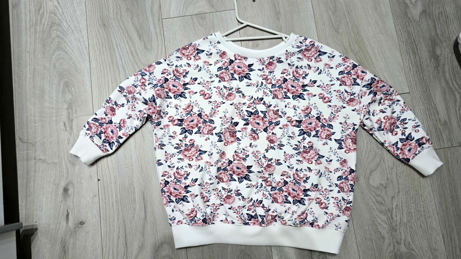 Bluza oversizowa dziecięca z opadającym ramieniem. Dół bluzy asymetryczny, przód krótszy tył dłuższy. Na wysokości klatki piersiowej luz konstrukcyjny ok 20-25 cm . Dół, rękawy oraz dekolt wykończony ściągaczem. Stan idealny